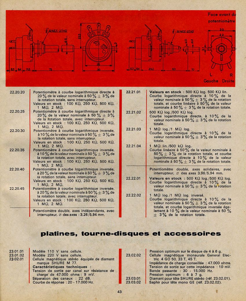 Je cite quelques marques qui sont dans ce catalogue pour les besoins de l'indexation des moteurs de recherche. Ca peut servir.... On trouve : Bandes magnétiques Sonocolor, Bobinages LCC, Manoury, condensateurs ajustables Ceramalter, Condensateurs Safco-Trevoux, Seco-Novea, Mineli, Steafix, Microfarad, Mial, Contacteurs Jean Renaud Fer à souder SEM, Ferrites Cofelec, Haut parleurs VEGA, Goodmans, Modules OREGA, Potentiomètres Matera, Radiohm, Mial, Résistances Matera, Seta, Ohmic, Langlade et Picard, Eurista, Transformateurs Manoury, VEGA, Semi-conducteurs COSEM.