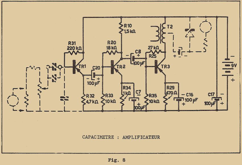 En figure 8 est dessiné le schéma électrique du récepteur, la partie du dessin en traits fins représente l’AMPLIFICATEUR B.F. tel qu’il se trouve après la modification apportée à l’oscillateur de la 13ème leçon pratique ; la partie en pointillé indique les éléments décâblés de l’oscillateur et la partie en traits gras représente le CIRCUIT DE DETECTION