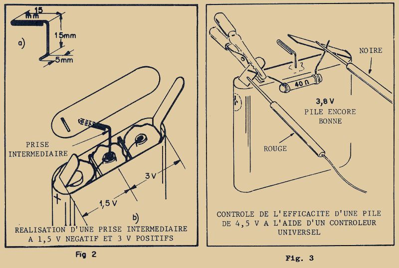 Ce contrôle consiste en la mesure des tensions sur les sorties des trois transistors employés dans le récepteur. Pour cela commutez votre contrôleur en gamme 10 volts continus et connectez le récepteur à une pile de 4,5V au moyen des fils torsadés munis de pinces crocodiles (la rouge au pôle positif et la noire au pôle négatif).
