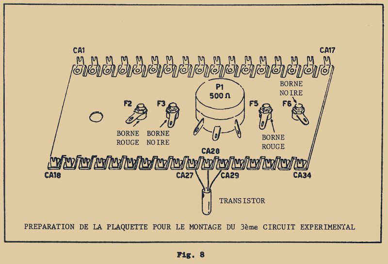 Disposez maintenant la plaquette de l’oscillateur automodulé à proximité du récepteur comme indiqué en figure 7 de façon à présenter le transformateur de l’oscillateur horizontalement et parallèle à la bobine du récepteur, à une distance de 10 cm environ de celle-ci. La plaquette III devra pour cela être disposée verticalement et tenue avec une main.
